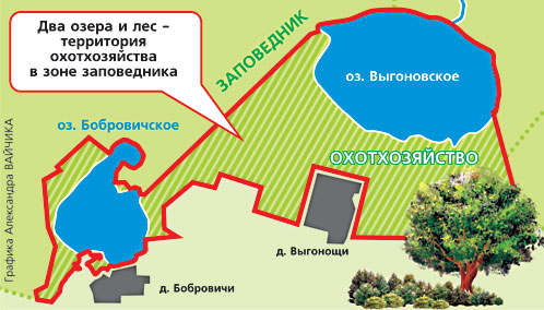 Республиканский ландшафтный заказник «Выгоновский» - это 55 тысяч гектаров с болотами, каналом Огинского, двумя крупными озерами - Бобровичским и Выгоновским рядом с одноименными деревнями. Почти по центру заказника - земли охотхозяйства, то есть охотхозяйство - в заказнике.