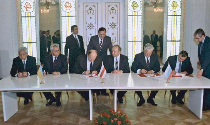 И 8 декабря 1991 года в Вискулях высшие должностные лица и главы правительств трех союзных республик Борис Ельцин и Геннадий Бурбулис (РСФСР), Станислав Шушкевич и Вячеслав Кебич (БССР), Леонид Кравчук и Витольд Фокин (УССР) подписали это преступное соглашение. Следует отметить, что в Вискули приглашался и только что избранный президент Казахстана Н.Назарбаев, но он решил не рисковать и посмотреть со стороны, чем все это кончится. И поэтому в Белоруссию не полетел, сославшись на нелетную погоду.