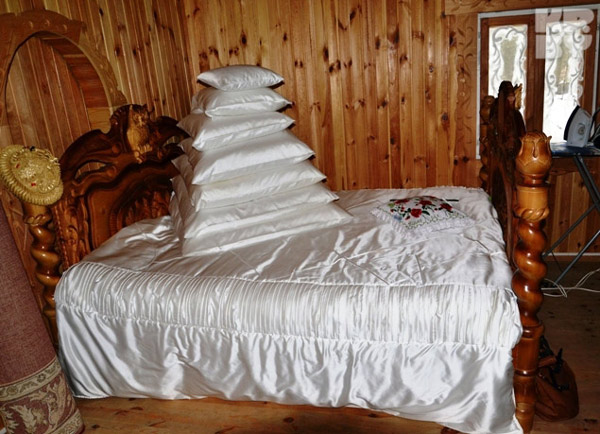 Внучка Деда Мороза ведет нас на второй этаж в спальню. У него там большая резная кровать, застеленная белым покрывалом, да семь подушек, сложенных горкой. В углу висят синие, голубые и красные шубы. В этом году дедушка заказал еще парочку, теперь у него несколько сменных синих и красных шуб. А сбоку на вешалках - осенние и весенние костюмы да летние брюки и кафтан.