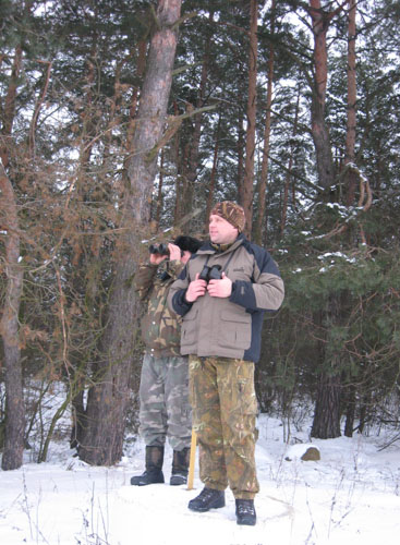 Мы грузимся в пущанский УАЗ и выезжаем из Каменюков в сторону Сухопольского лесничества, что в Пружанском районе. Именно там, по сообщениям егерей, сейчас самая высокая концентрация зубров. По дороге главный охотовед Олег Щитов и главный «зубровед» кандидат биологических наук Алексей Буневич вводят меня в курс дела. Учеты зубров, в отличие от других копытных, ведутся исключительно визуально, рассказывают они. Зимой зубры сбиваются в группировки, иногда очень большие, и держатся в местах кормежки, очень часто – на ближайших к пуще колхозных полях, где их легко подсчитать. В каждом пущанском лесничестве есть техник-охотовед и егерь, и считать зубров – их обязанность.