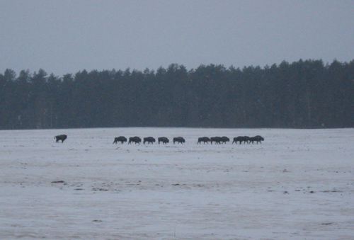 От Адрияновки сворачиваем в лес и долго едем по лесной дороге в сторону сельхозугодий ОАО «Мурава». Еще не доехав до опушки, сквозь поредевшие деревья видим: бродят наши зубры! Да не один-два, а сразу 15! Услышав шум машины, немедленно оттягиваются дальше в поле. Летом здесь росла сахарная свекла. Урожай убрали, но что-то осталось. Вот зубры и копытят землю в поисках вкусненького. Кормятся на полях они обычно ночью, днем нередко уходят в лес на лежку.