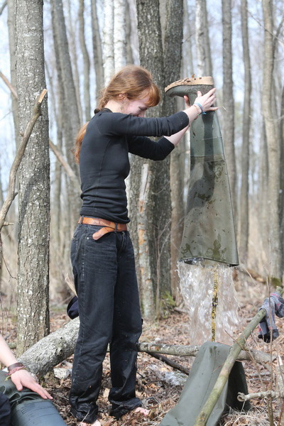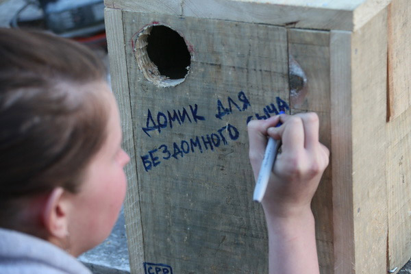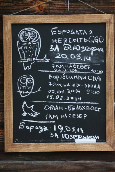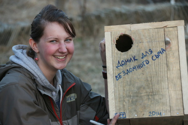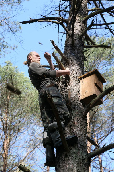 Адну з птушыных хатак, зробленую па адпаведным чарцяжы рукамі дзяўчат з Расіі і аздобленую іх памятным аўтографам, удзельнікі аднеслі на невялікае верхавое балотца на ўскрайку лесу. Дзяніс Кіцель прадэманстраваў свой спрыт: забраўся на дрэва і замацаваў на вышыні «кватэру»для вераб’інага сычыка. Лёгкасць караскання па дрэвах тлумачыцца вялікім вопытам: больш за дзве тысячы разоў арнітолаг залазіў на дрэвы, вывучаючы жыццё птушыных драпежнікаў. З лёгкай рукі Дзяніса большасць створаных ім штучных платформаў і хатак засяляюцца птушкамі. Давядзецца Кіцелю развешваць і астатнія «апартаменты», зробленыя падчас працы лагера — і для махнаногага сыча, і для савы-сіпухі, і для вушастай савы. Вага некаторых гэтых «шпакоўняў» больш за 10 кілаграмаў — паспрабуй усцягні!