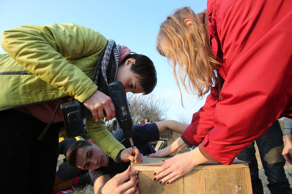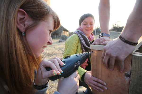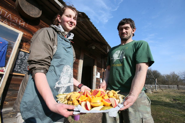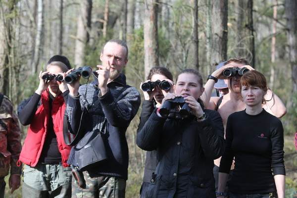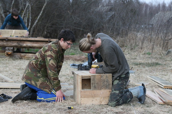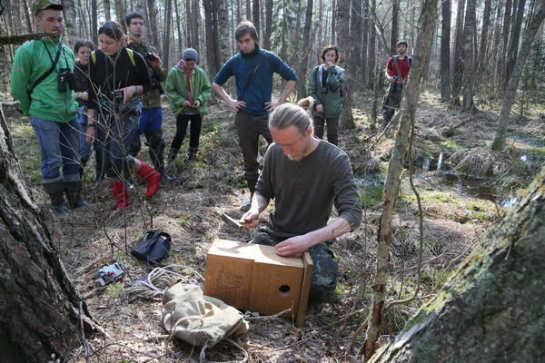 Гэты імклівы надыход вясны заспеў удзельнікаў лагера не з пустымі рукамі: птушак ужо чакалі некалькі гатовых хатак, падобных на шпакоўні, ішла бойкая работа над новымі драўлянымі канструкцыямі. Гаспадарамі незвычайных новабудоўляў павінны стаць совы і сычыкі. Стварэнне новых домікаў і пляцовак для гнездавання савіных відаў якраз і з’яўлялася адным з праграмных мерапрыемстваў лагера «Начныя жыхары ляСоў». Не давялося сумаваць маладому арнітолагу Дзянісу Кіцелю (на фотаздымку), для якога вывучэнне соў з’яўляецца ці не асноўным заняткам жыцця. Ён ладзіў майстар-класы па развешванні домікаў, праводзіў лекторыі і вадзіў групы па балотных дарогах.
