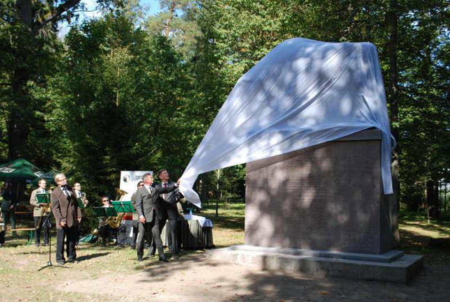 «Этот памятник поставлен на месте предыдущего памятника 1862 года в память о первой охоте царя Александра II в Беловежской пуще по инициативе Общества польских охотников и благодаря помощи рядовых охотников и участию Беловежской национального парка.