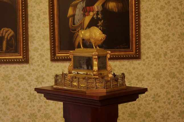 Первая мировая война, пришедшая на беловежскую землю в 1915 году, принесла разрушительные перемены в жизнь Беловежской пущи. Многие пущанские деревни были сожжены русскими казаками, а их население было изгнано далеко на восток. Вместе с многочисленными экспонатами императорского охотничьего дворца в Беловеже в «беженство» увезли и бронзовую статую зубра. Уже после окончания войны в 1924 году руководством Советского Союза монумент был передан из Москвы в Польшу. Однако статуе зубра не суждено было вернуться на свое родное место – решением президента Польши Игнация Мосцицкого в 1928 году скульптуру поместили в Спале – еще одном историческом месте проведения императорских охот, которое позднее стало летней резиденцией польских президентов. За прошедшее время царский памятник зубру стал визитной карточкой этого места.