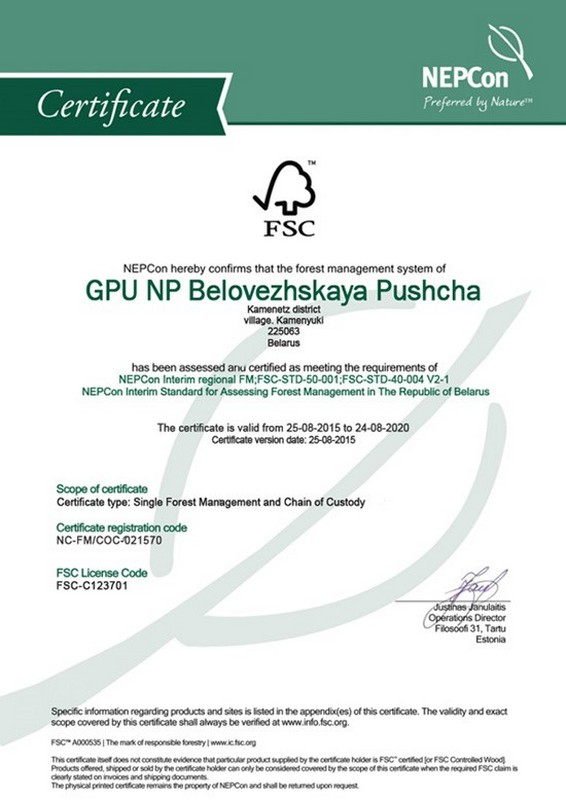 Сертификат является гарантом соблюдения всех норм, правил и требований того места, где ведётся лесозаготовка. В данном случае это территория лесоохотничьих хозяйств нацпарка «Беловежская пуща».