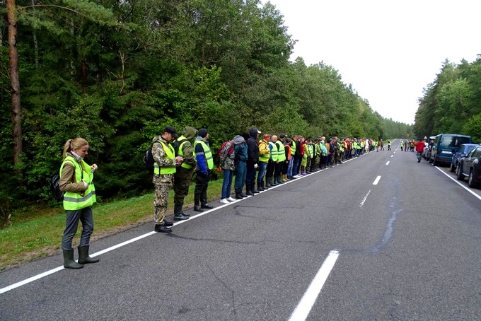 Вдоль дороги выстраивается цепочка из 80 человек. Он растягивается метров на 400. Через каждые 10 волонтеров стоит координатор. Но раций только три, две по бокам цепи и одна в центре. Во время инструктажа объясняют, как двигаться, когда останавливаться, что проверять и на что обращать внимание.