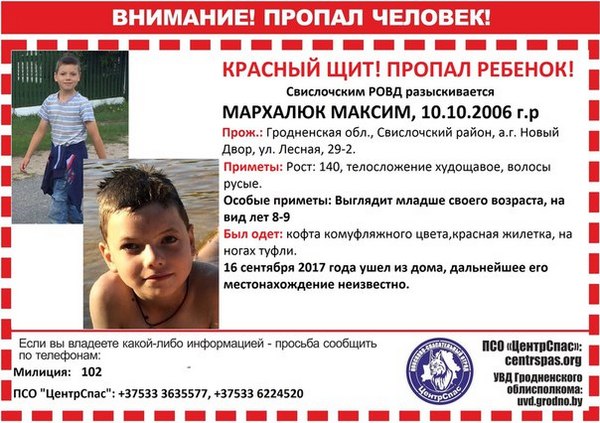 В этот же день, 26 сентября, Свислочским районным отделом Следственного комитета по факту исчезновения 16 сентября жителя деревни Новый Двор Свислочского района Гродненской области Максима Мархалюка в соответствии с п.2 ст.167 Уголовно-процессуального кодекса Республики Беларусь возбуждено уголовное дело. Основанием для принятия указанного процессуального решения послужило истечение десяти суток с момента подачи заявления об исчезновении ребенка и неустановление его местонахождения в ходе проведенных оперативно-розыскных мероприятий.