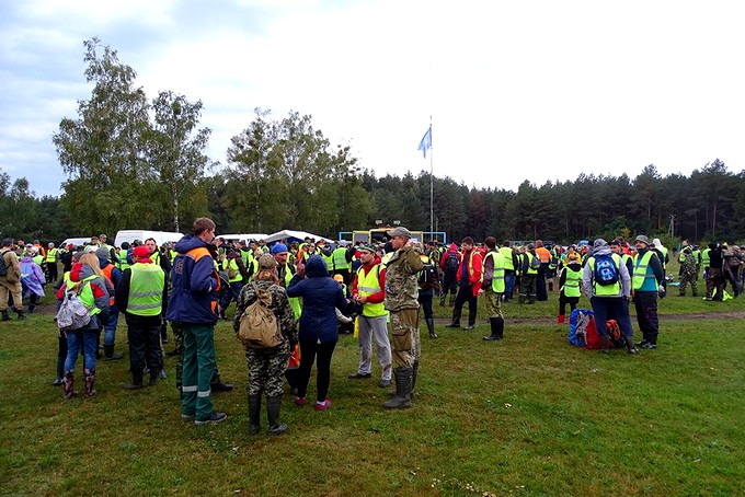 В лагере собралось больше тысячи волонтёров со всей страны. Здесь одинаково много и мужчин, и женщин. Утром холодно, пасмурно: как бы не было дождя. Жужжит в воздухе квадрокоптер. Все в светоотражающих жилетах, в камуфляжной одежде. Кто-то обматывает ноги целлофаном и скотчем, чтобы защититься от клещей. Знатоки на это смотрят с усмешкой, потому что ноги в таких условиях адово потеют, а пот из-за целлофана не испаряется.