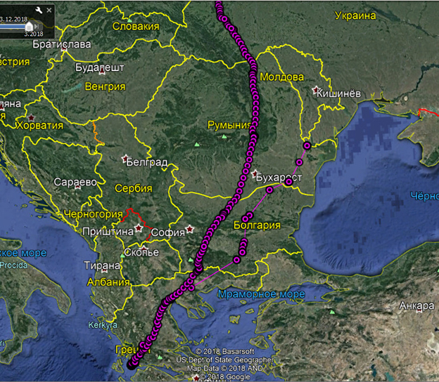 4 марта он покинул место зимовки и проделал безукоризненный маршрут через Аравийскую пустыню, Суэцкий перешеек и Синайскую пустыню, совсем немного заплутал в пустыне Негев и вечером 9 марта уже отдыхал недалеко от г. Назарета в Израиле. 10 марта Перун пересек границу Ливана и оказался перед обширной очень густонаселенной и безлесной местностью. Словно наткнувшись на препятствие (или ружейные выстрелы?), резко повернул на восток, пролетел вдоль границы и снова попал на территорию Израиля. Там поднялся на север вдоль долины Иордана и пересек границу Ливана уже по лесистым склонам гор. По этим лесам он и держал путь, пока не пересек весь Ливан и Сирию. 12 марта в полдень Перун добрался до Турции. Здесь можно выдохнуть. Самый опасный участок маршрута, нашпигованный любителями пострелять по живым мишеням, как патронташ патронами, остался позади. Если спроецировать протяженность проделанного Перуном пути на балканских птиц, то, например, Блонд, с которым он начал миграцию в один день, был бы уже в своем гнезде в Беларуси. Все-таки лететь над нагретой землей птицам-парителям с широкими крыльями несравненно легче, чем над раскисшей от мокрого снега холодной грязью.