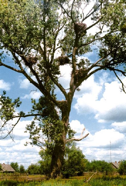 Однажды в апреле 1999 г. я проходил по мелиорированным лугам Дикого Никора, принадлежащих большому колхозу. На окраине этого однообразного сельскохозяйственного ландшафта осталась ненарушенной одна старенькая деревушка с шестью дворами. Вокруг деревни на огромных тополях расселилась колония белых аистов (Ciconia ciconia). Я насчитал двенадцать жилых гнезд на пяти тополях. Одно большое гнездо показалось мне незанятым. Тщательно осмотрев его в бинокль, я увидел два пучка перьев (ушек), развевающихся на ветру, и к моему огромному удивлению два больших оранжевых глаза, смотрящих на меня из гнезда. Это был филин (Bubo bubo), поселившийся в гнезде аиста в 3 4 метрах от двух других гнезд, занятых белыми аистами! Как выяснилось позже, это было первое гнездо филина, найденное до сих пор в Пуще. Во время ночных обследований мы слышали в разных местах крики других филинов. Однажды услышали даже крики двух враждующих самцов. В общем, в белорусской части Беловежской пущи должно обитать,