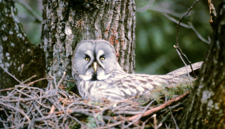 После нескольких неудачных ночных поездок в 1999 г., в середине апреля в десять часов вечера мы услышали брачную песню бородатой неясыти (Strix nebulosa) в южной части Пущи. Мы нашли свежие погадки в великолепном старом еловом лесу и увидели гнездо на дубе, находящееся неподалеку от ольхового болота. К сожалению, птиц в то время в гнезде еще не было. Через несколько дней после моего возвращения в Нидерланды я получил сообщение о том, что совы заняли это гнездо. В 2000 году бородатая неясыть опять заселила это гнездо. Но в 2001 году мы обнаружили, что территория занята парой филинов, которые выбрали это же самое дерево и вывели, по крайней мере, одного птенца (его нашли у комля дерева на земле). Во время полевых обследований с голландскими экотуристами в мае 2001 года мы наблюдали прекрасную бородатую неясыть сидящую с жертвой на дереве на южной окраине болота Дикое.