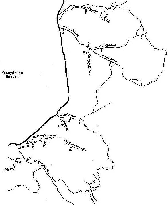 В ноябре 1993 года было проведено рекогносцировочное обследование 14 водных объектов (20 створов) национального парка, а в течение 1994-95 годов - сезонные наблюдения, на отдельных створах рек Нарев, Рудавка, Колонка, Наревка, Правая Лесная, ручья Песец и водохранилища Старое Лядсковское (рис. 1).