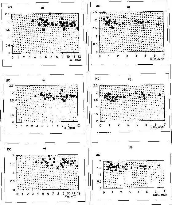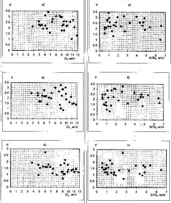 Корреляция индекса видового разнообразия как с величинами индексов сапробности, так и с основными химическими показателями чрезвычайно мала (табл. 3, рис. 3). Эта особенность, наряду с относительно низкими значениями и высокой вариабельностью является, как указывалось ранее, следствием нестабильности ручьевых биоценозов.
