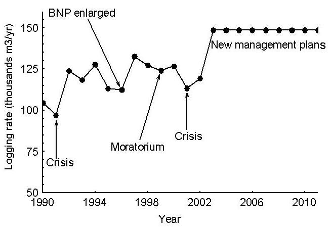 Рис. 1. Уровень эксплуатации – объем товарной древесины, проданной тремя лесничествами Беловежской пущи (Беловежа, Бровск, Хайнувка) за период 1990-2002 гг. (по данным администрации лесничеств). Заготовка древесины увеличивалась после каждого из трех мероприятий по выведению из хозяйственной деятельности части территории Беловежской пущи для целей сохранения природы. Снижение заготовок наблюдалось только во время периода низких цен, называемого «кризисом». Показаны также объемы древесины, которые должны быть заготовлены в 2003 – 2011 годах согласно плану управления, вступившему сейчас в силу (график подготовлен проф. Т. Веселовским).