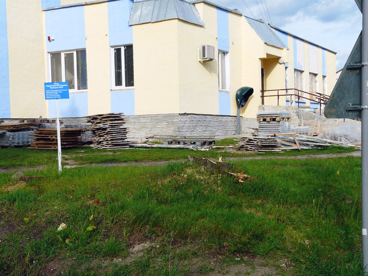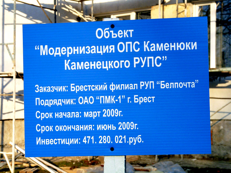 На фотографии ниже – информационный щит, паспорт объекта, установленный перед зданием почтового и банковского офисов.