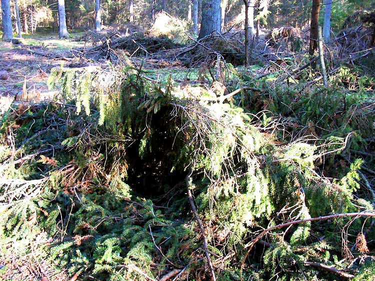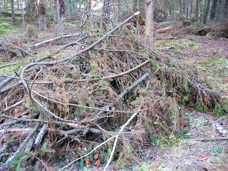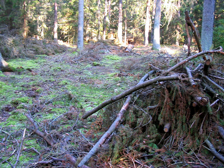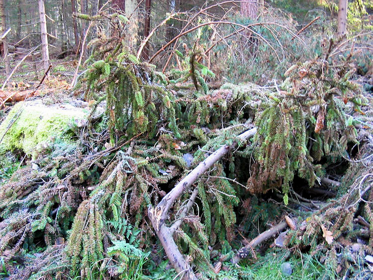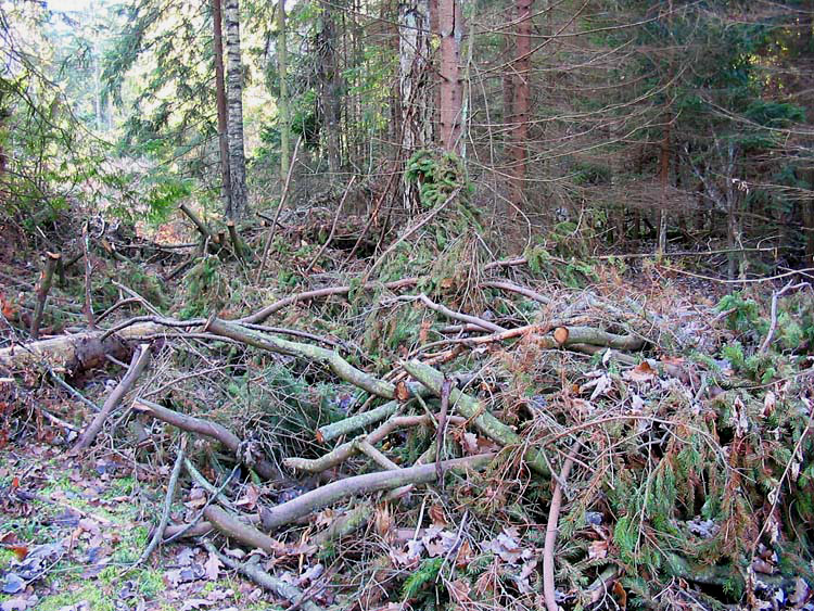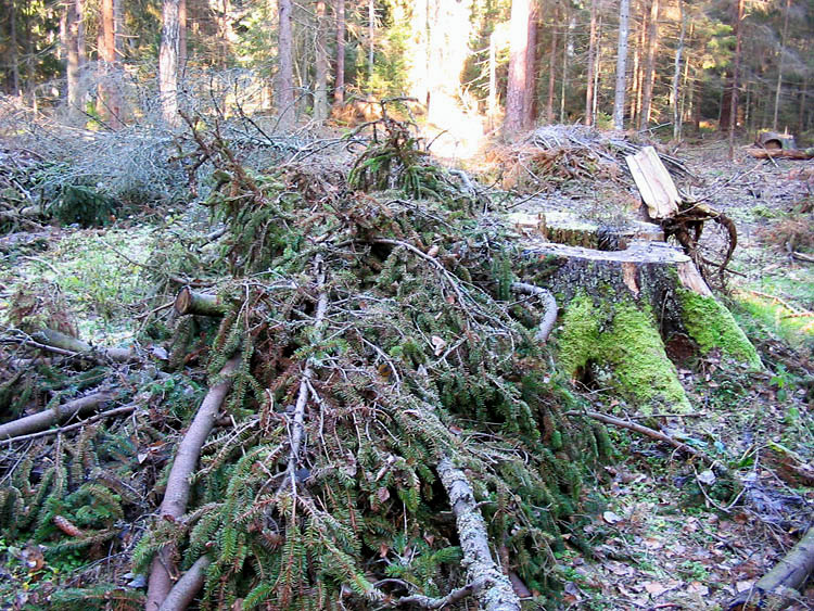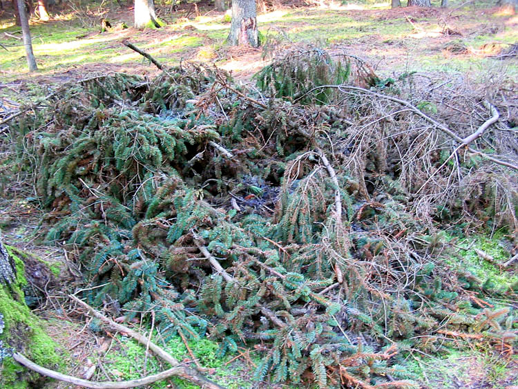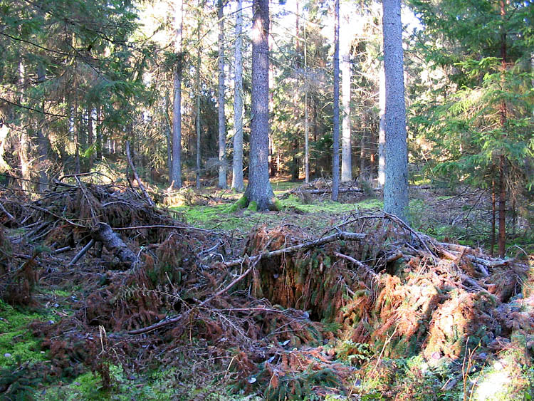 Здесь показаны порубочные остатки – сложенные в кучи еловые ветки, среди которых много с зеленой хвоей.