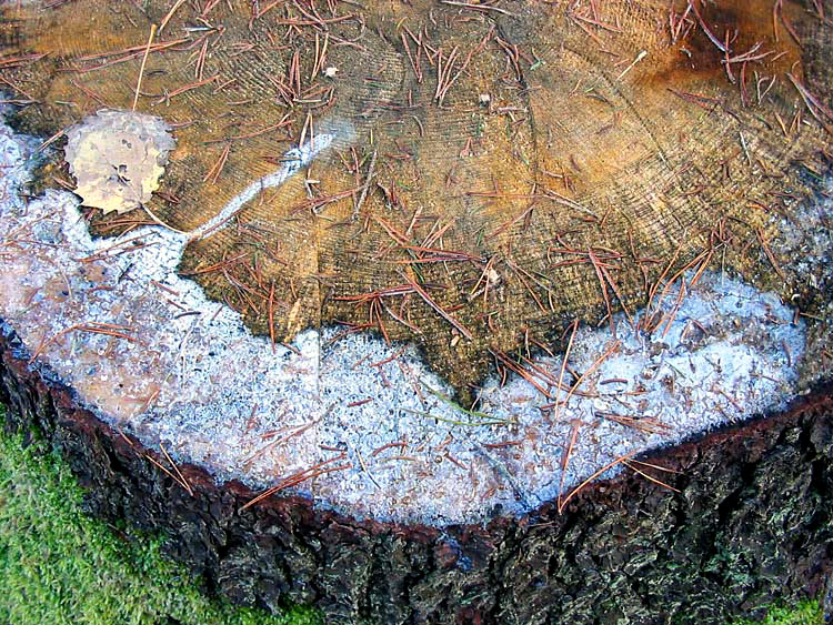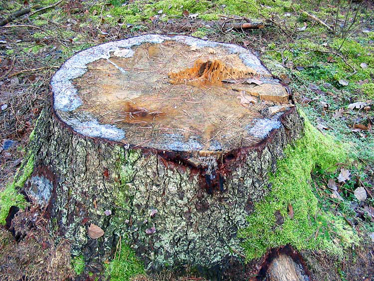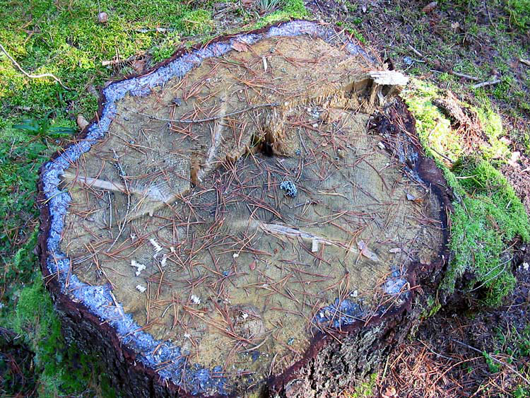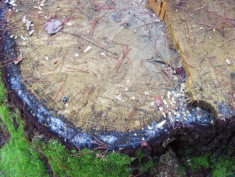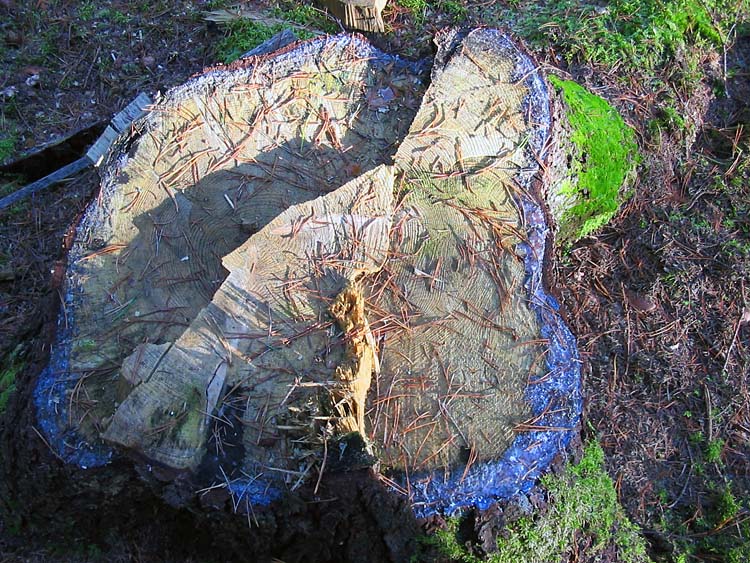 На этих снимках показаны пни с сильным смоловыделением, определяемым по интенсивной боковой кайме белого цвета. Это может служить индикатором того, что вырубаемые ели имели еще достаточно большой запас смолы (а, следовательно, и силы), чтобы противостоять короедам.