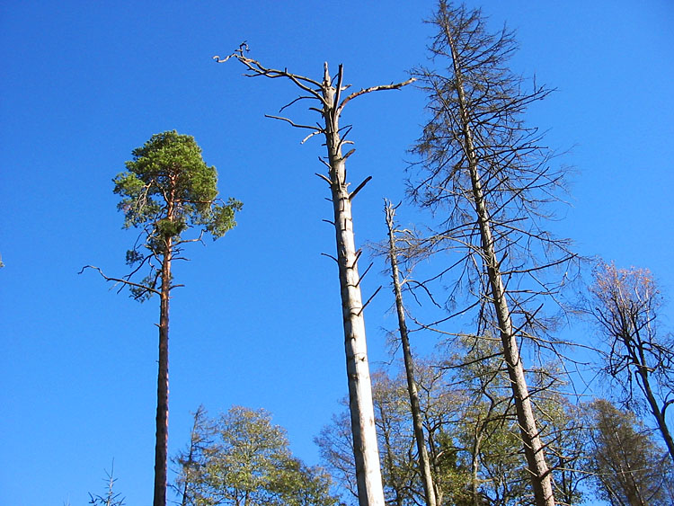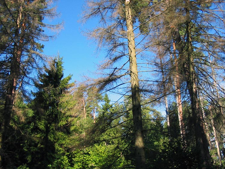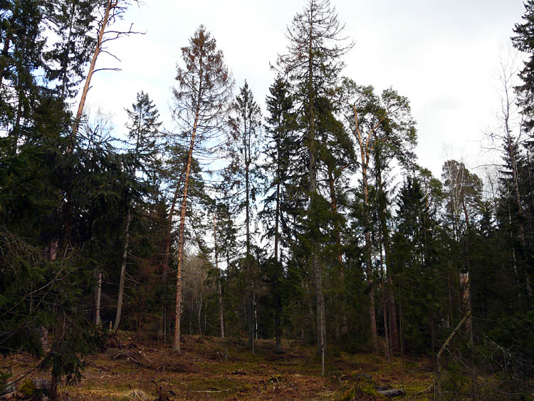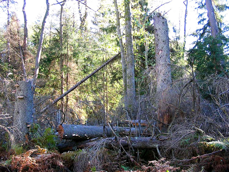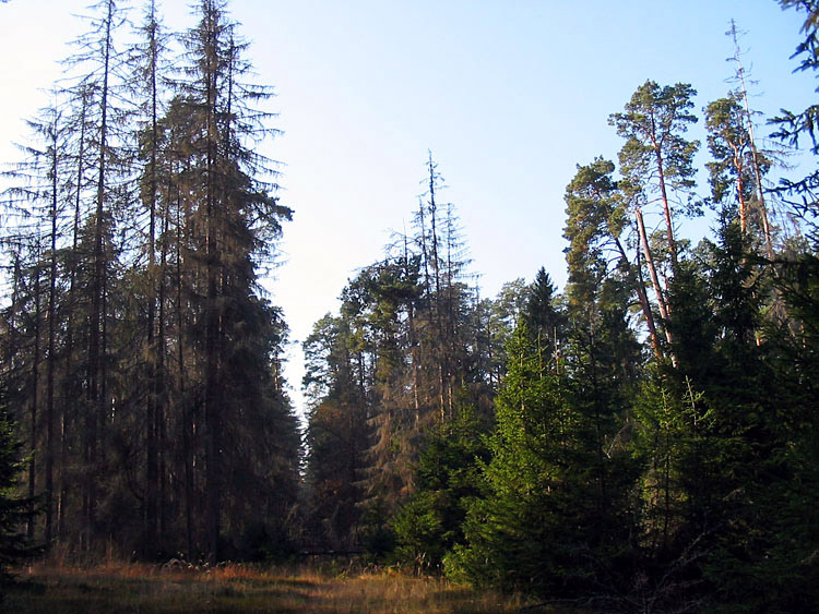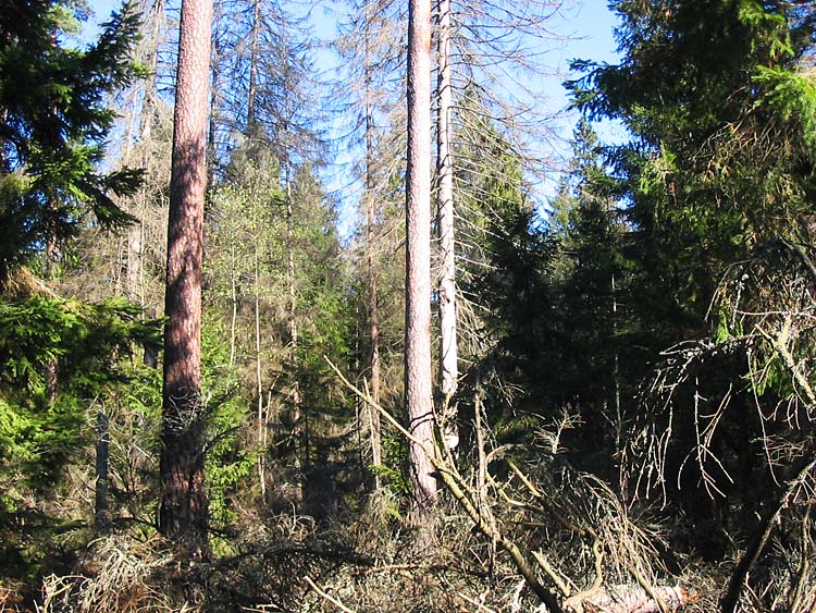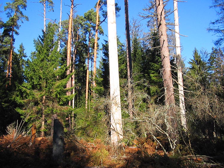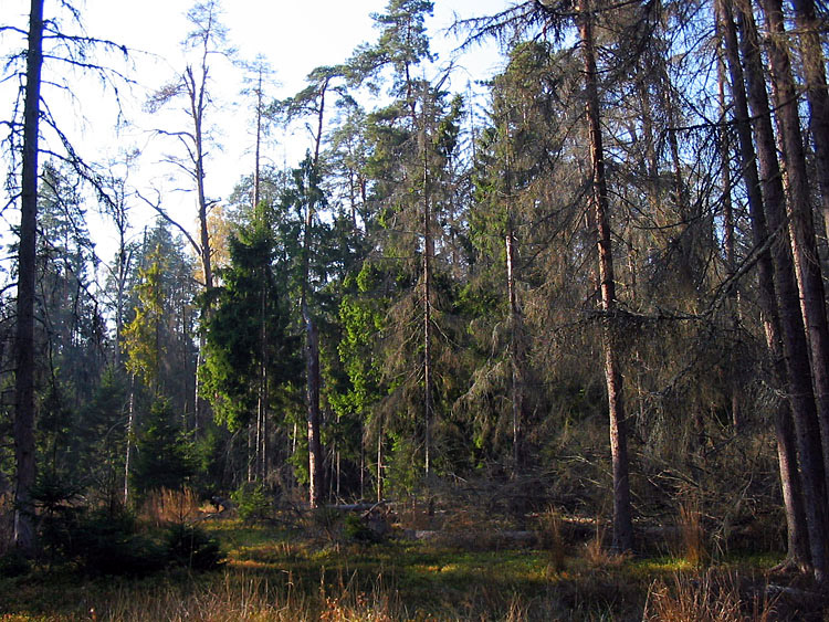 На этих снимках показаны участки леса Беловежской пущи, пострадавшие от короеда. Эти участки находятся либо в трудно доступных для лесорубов местах, либо древесина на них не представляла собой особой коммерческой ценности. По этой причине первобытный дикий лес здесь не был вырублен.
