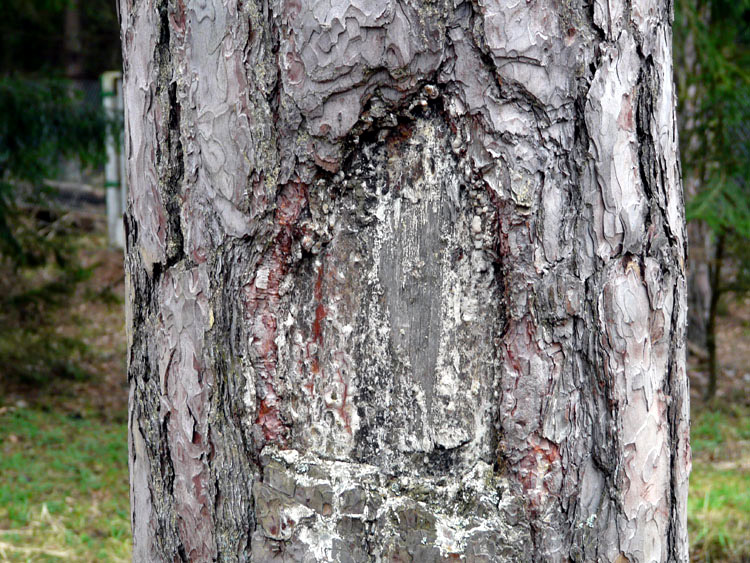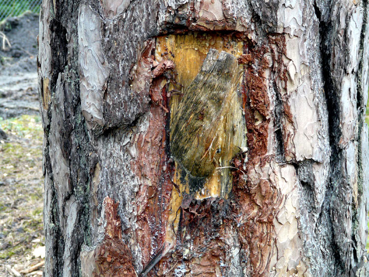 На этих фотографиях видно, что при строительстве глубинной скважины у части старовозрастных сосен, не вырубленных строителями, была повреждена кора на стволах.