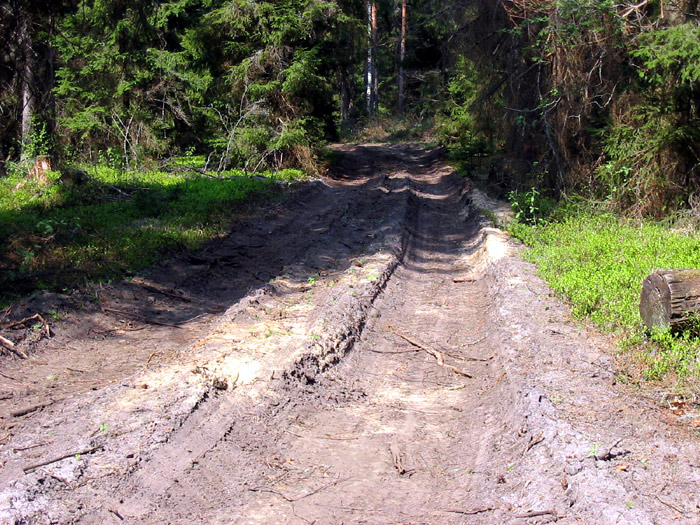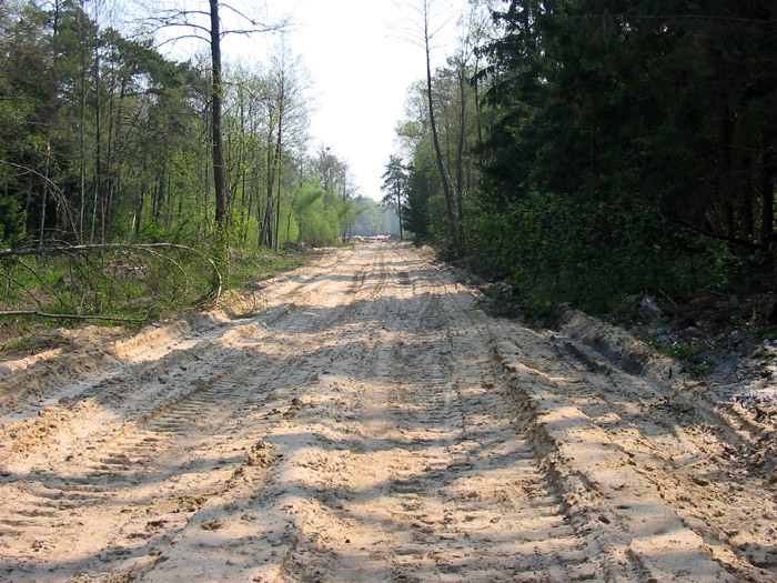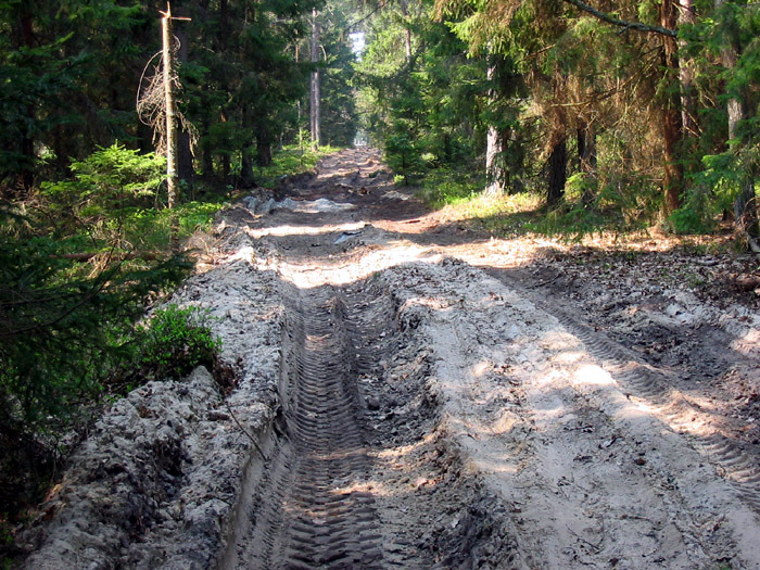 (Разбитые тяжелыми машинами лесные просеки возле новой глубинной скважины; 7 мая 2006 г.) |