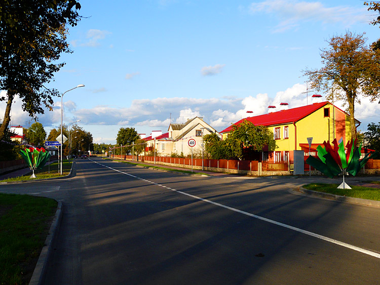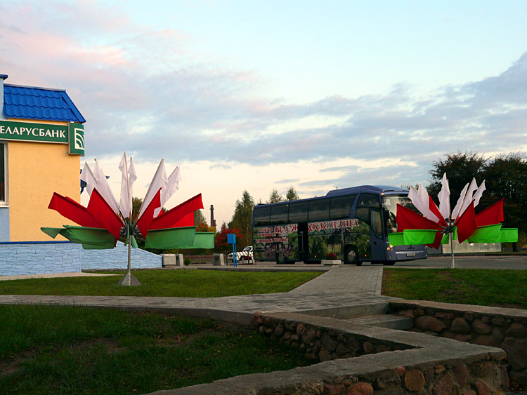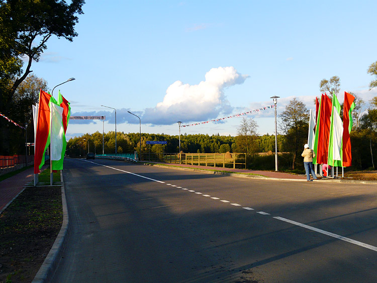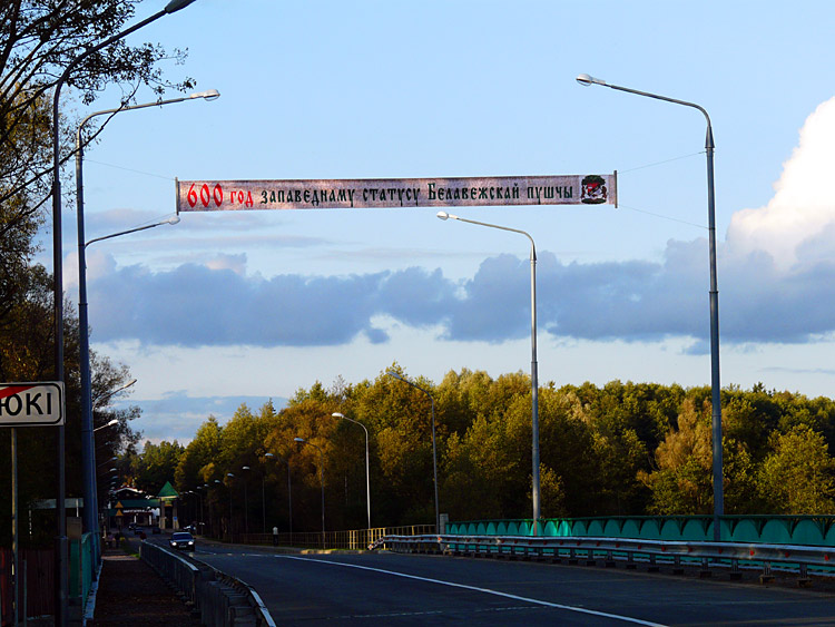 В конце деревни над мостом через реку Правая Лесная, переезжая который туристы по полукилометровому участку дороги движутся к центральному въезду в национальный парк, повесили транспарант с надписью на белорусском языке "600 лет заповедному статусу Беловежской пущи"* (это русский перевод) и гербом национального парка.