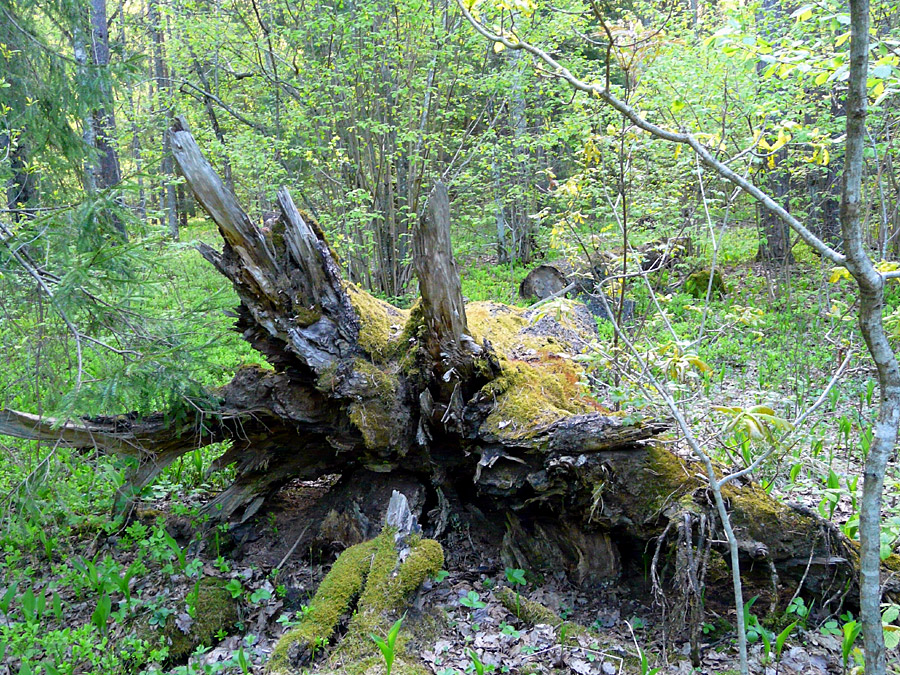 | (Крупный еловый выворотень в лесу рядом с автомобильной дорогой; весна 2011 г.) |
