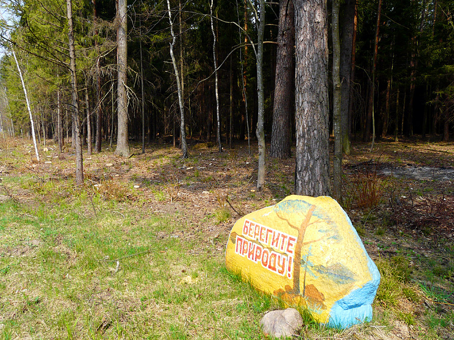 В Беларуси есть традиция использовать большие камни возле дорог для написания на них природоохранных лозунгов. Ниже на фотографиях показаны подобные примеры со словами "Берегите природу и лес". На первом снимке за камнем виден вырубленный от кустарника и мелких деревьев, вычищенный лес. Так может быть правильно будет вложить истинный смысл в эти лозунги и наконец-то разобраться, как правильно беречь природу?
