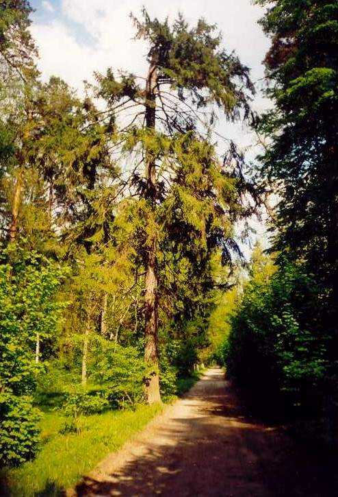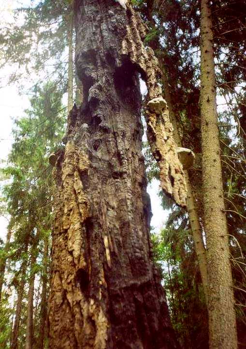 На этом снимке старая ель со сломанной вершиной. Ель не погибла, а с верхней ветки у нее начала расти новая вершина. Эта уникальная ель продолжает расти прямо на центральном туристическом маршруте в районе зубропитомника возле дороги, которая ведет к дубу и сосне-великанам. А ведь по всем лесхозовским правилам она должна была быть уже давно срублена.