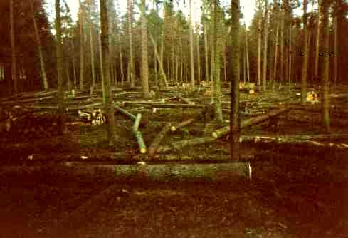 Но даже при таких избирательных рубках экологические нарушения в лесу значительны, так как при рубке и трелевке древесины повреждаются подстилка, почва, травяной покров, кустарники, молодые деревца, корни взрослых деревьев. На снимке видно, насколько сильно почва перемешана колесами тракторов после трелевки древесины.