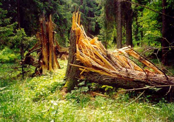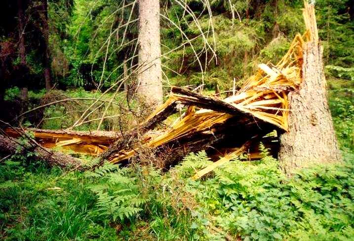 На снимках сломанные ветром короедные ели создают необыкновенную картину дикой природы первобытного заповедного леса. По санитарным правилам для лесхозов лес должен очищаться от таких деревьев.