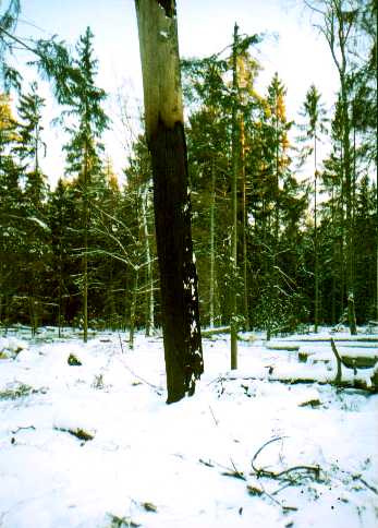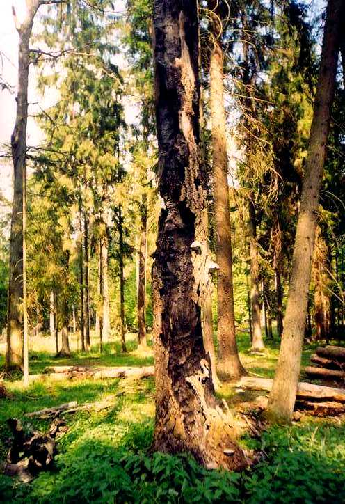 На снимке показан пораженный короедом участок леса, где рубка не проводилась. Короедный очаг сам по себе затухает, а в лесу сохраняется первичная среда обитания и создается высокая мозаичность растительности и микроусловий.