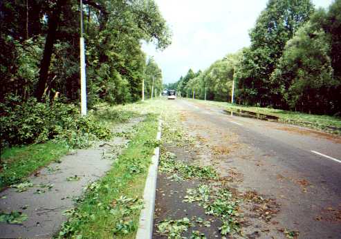 На первом снимке показан ветровал в лесу после второго урагана. На втором снимке так выглядела после бури центральная дорога, идущая к въезду в Национальный парк со стороны деревни Каменюки. Она вся усыпана сломанными ветками, а по бокам дороги лежат отдельные сломанные деревья старых ив.