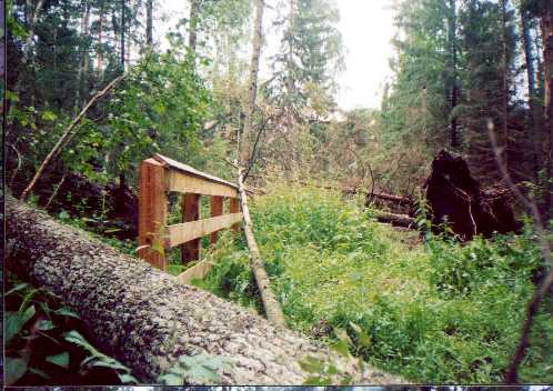 Ураган нанес небольшой ущерб некоторым туристическим объектам на территории Национального парка. На первом снимке упавшее дерево проломило крышу на домике-кассе, что перед входом в вольеры с дикими животными. На следующих двух снимках видны поваленные деревья осины, которые поломали новый забор, сооруженный вокруг вольеров с дикими животными.