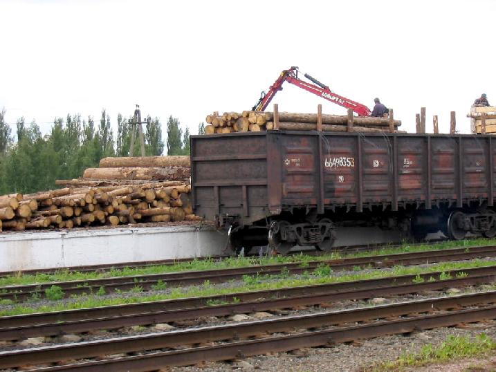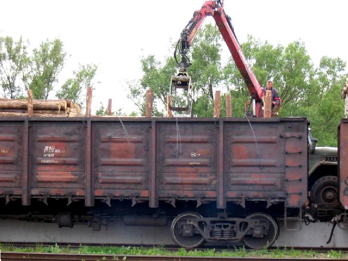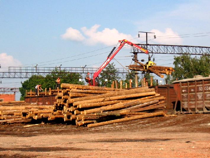 Доставленная древесина загружается лесовозами, оснащенными специальными подъемниками, в железнодорожные вагоны.