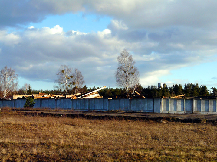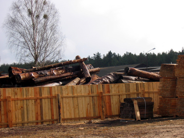 На этих снимках – так выглядит северная сторона лесозавода из далека. За высоким бетонным забором лесозавода – наваленные в кучи и штабеля полусгнившие бревна, бывшие когда-то элитными деревьями Беловежской пущи.