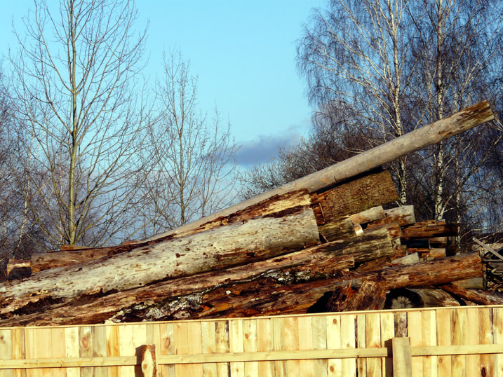 | (Полусгнившая древесина за забором на северной стороне лесозавода, 2 марта 2008 г.) |
