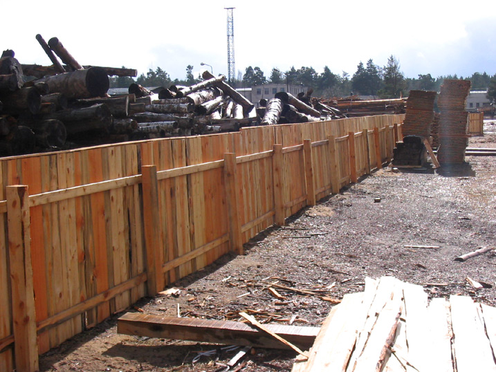 Здесь показан новенький деревянный забор, которым закрыли кучи и штабеля свезенных полусгнивших бревен.