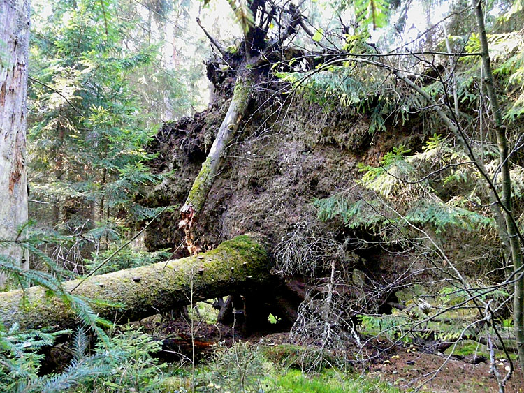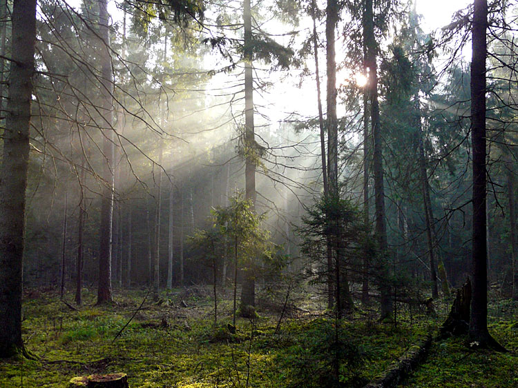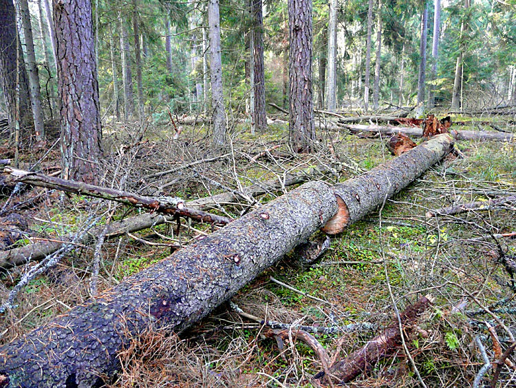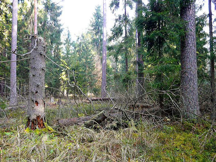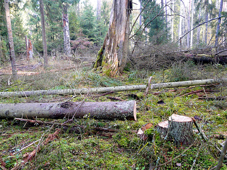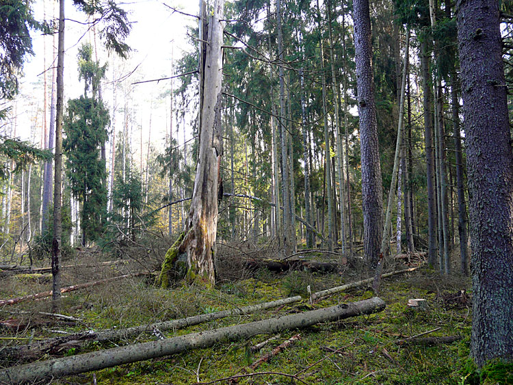 Так выглядят участки леса в управляемой природной зоне, на которых давно не проводились рубки. Прекрасный, хотя и слегка нарушенный, дикий, первобытный лес.