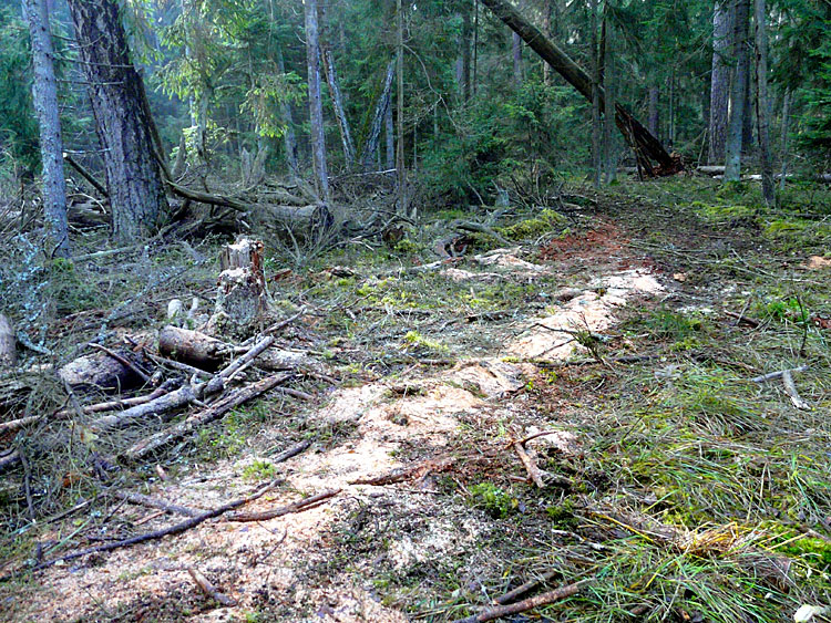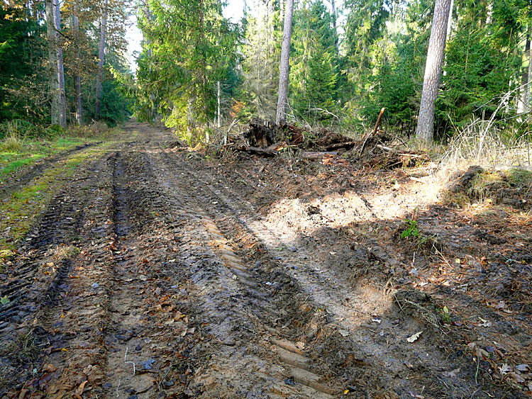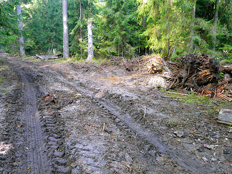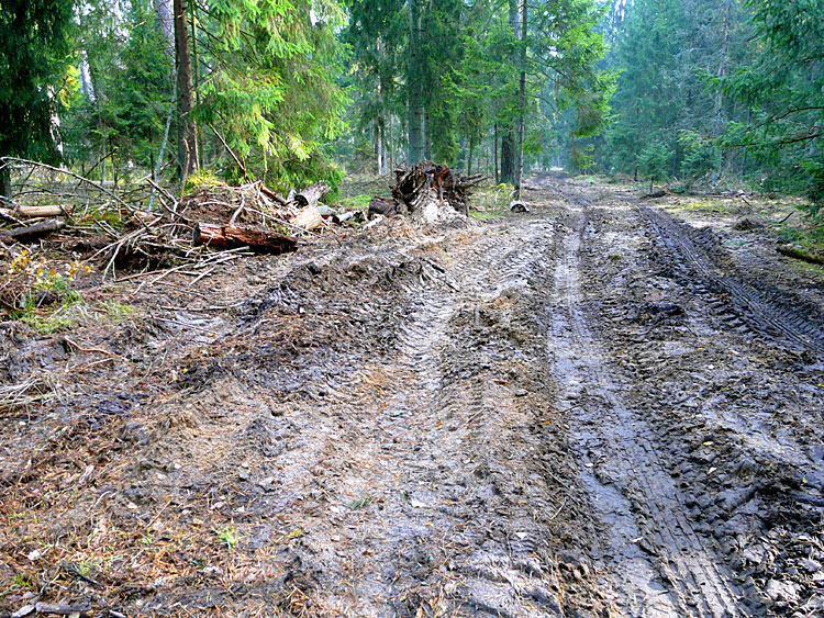 На некоторых участках проводят расширение просек для удобства проезда крупных лесовозов. Делается это бульдозером, безобразно с экологической точки зрения, так как кучи земли затаскиваются прямо в лес, нарушая микрорельеф участка охраняемого леса.