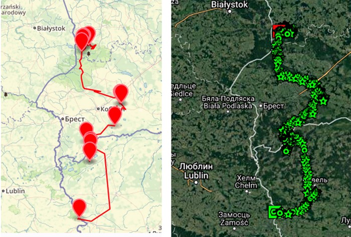 Зажатый со всех сторон стаями своих собратьев, он держался от них в стороне, предпочитая отдыхать на сельхозугодиях. Когда на полях убрали кукурузу, скрываться стало тяжелее. Михаил решил попытать счастья в лесах, прошел всю пущу с севера на юг, но, очевидно, пристанища себе так и не нашел. Территория пущи поделена между «своими» волками, и чужаков здесь не терпят. Пришелец отправился дальше на юг Беларуси, сделав солидный крюк прошелся по республиканскому заказнику «Званец». Остановившись на несколько дней возле павшей лосихи, ушёл на территорию Украины в Шацкий национальный парк. Но, то ли климат ему не подошел, то ли местные волки пугнули, и он вернулся в Беларусь. Чтобы узнать, чем питался он по ту сторону границы, наша команда организовала экспедицию в Украину по тем местам, которых волк больше всего держался. Как оказалось это опять были свалки.