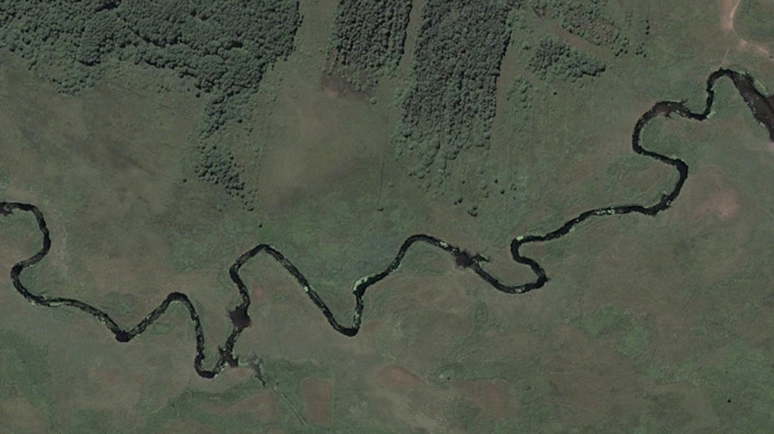Река Правая Лесная в ее естественном состоянии (спутниковый снимок, сделанный из космоса и размещенный в системе Maps-Google) |