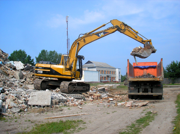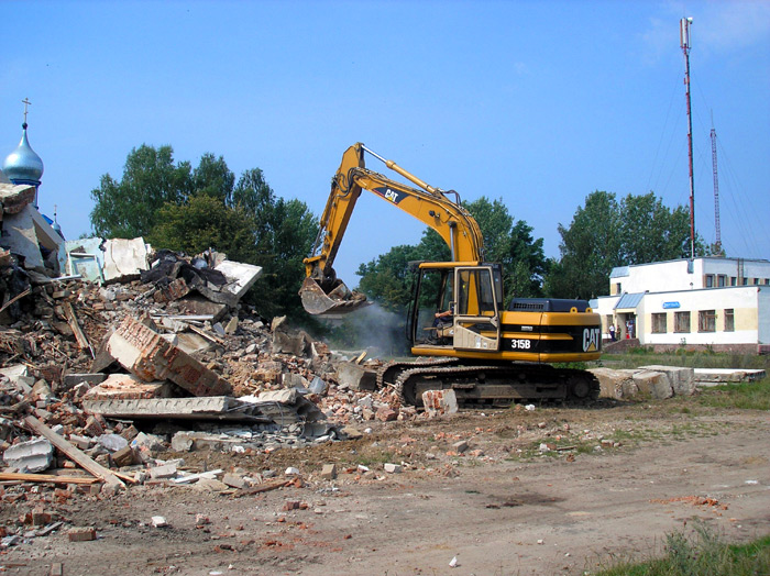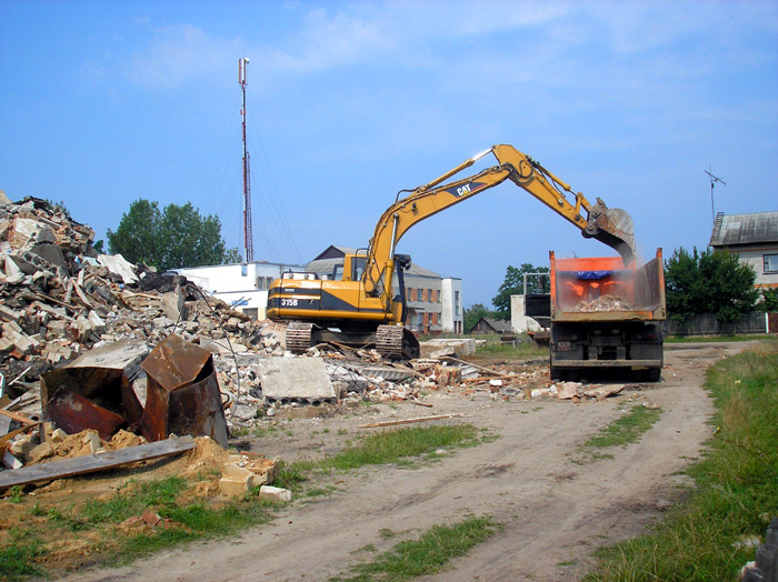 21 августа 2007 г., спустя 2 с половиной месяца после того, как в Беловежской пуще взорвали дом культуры, наконец-то начали разбирать его руины. Сегодня сюда приехал экскаватор и самосвал и работа началась.