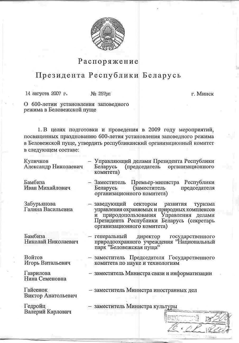 Согласно утверждённым ЮНЕСКО правилам наше государство, на чьей территории находится природный объект, должно организовать празднование юбилейной даты на высоком национальном уровне. Поэтому республиканский организационный комитет, в состав которого вошли Управляющий делами Президента Республики Беларусь А. Н. Куличков (председатель), заместитель Премьер-министра И. М. Бамбиза (заместитель), заведующий сектором развития туризма управления охраняемых природных комплексов и природопользования Управления делами Президента Республики Беларусь Г. В. Забурьянова, генеральный директор ГПУ НП «Беловежская пуща» Н. Н. Бамбиза, Министр природных ресурсов и охраны окружающей среды Л. И. Хоружик, заместители Министров иностранных дел, связи и информатизации, культуры, образования, лесного, сельского хозяйства и другие должностные лица уже сейчас приступает к подготовке к 600- летию установления заповедного режима Беловежской пущи.