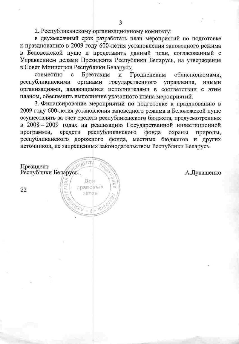 - Предупредил об уголовной ответственности в будущем всех лиц, виновных в нарушении закона при выполнении планируемого проекта, если такое нарушение будет допущено, а также лиц, причастных к осуществлению проекта, но проявлявших халатность и безответственность в плане недопущения нарушений законодательства. Напомнил также о персональной денежной компенсации ущерба, который будет нанесен Беловежской пуще, и стоимости работ по ликвидации этого ущерба и восстановления естественного природного облика Беловежской пущи;
