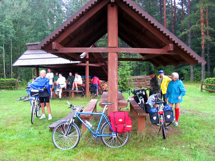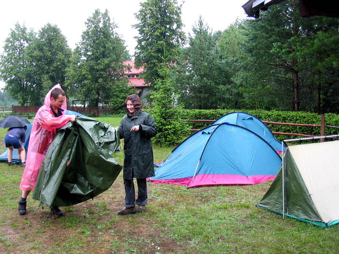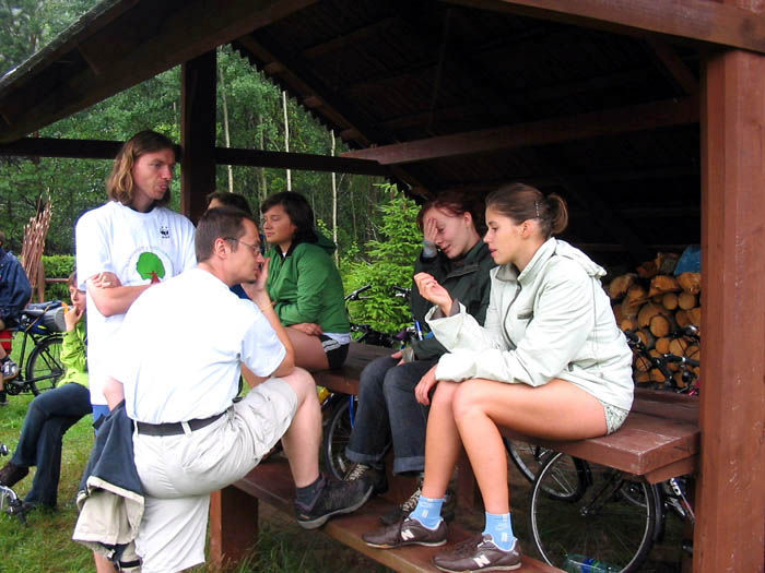 | Под навесом, прячась от дождя, можно поговорить о том, как сохранить Беловежскую пущу. |
