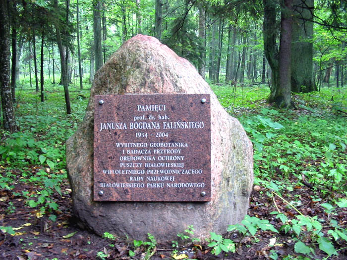 Камень в память о выдающемся ученом и защитнике Беловежской пущи профессоре Януше Фалинском, установленный у входа в заповедную зону. |