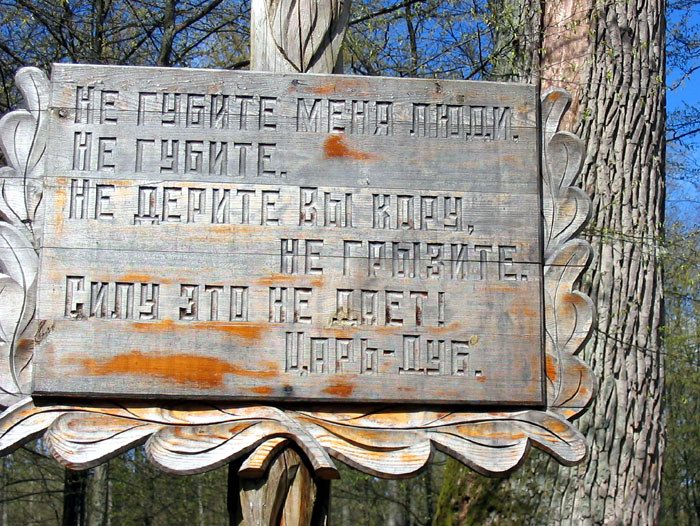 Установленная возле дуба табличка гласит "Не губите меня люди, не губите, не дерите вы кору, не грызите, силу это не дает! Царь-дуб". |