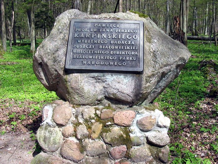 | У входа в Национальный парк установлены памятные камни выдающимся людям, внесшим значительный вклад в сохранение Беловежской пущи. Один из них – Яну Ержи Карпинскому, бывшему директору парка. |