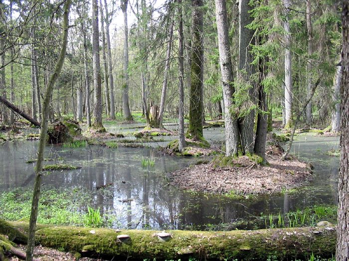 Заболоченный участок дикого первобытного леса Беловежской пущи. Именно такую природу, а не пни и вырубки, показывают поляки приезжающим туристам. |